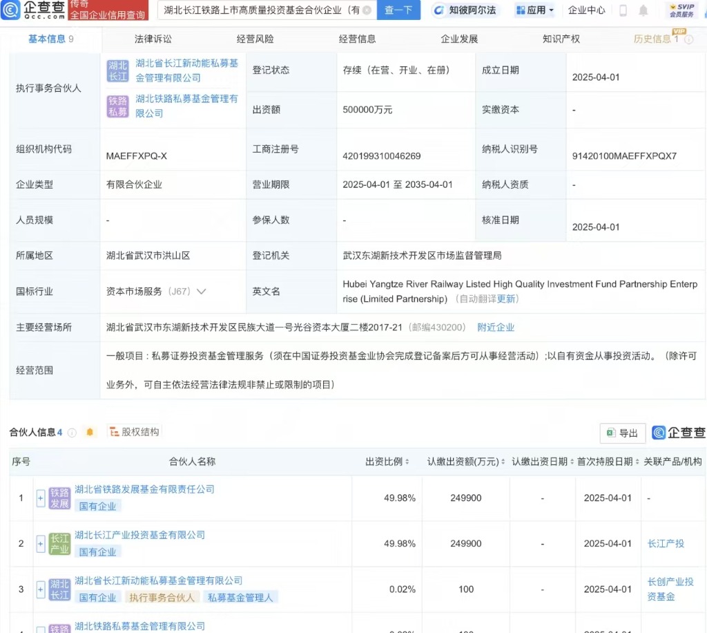 上证报中国证券网讯企查查APP显示,近日,湖北长江铁路上市高质量投资基金合伙企业(有限合伙)成立,出资额50亿元,经营范围包含:私募证券投资基金管理服务;以自有资金从事投资活动。企查查股权穿透显示,该企业由湖北省铁路发展基金有限责任公司等共同出资。